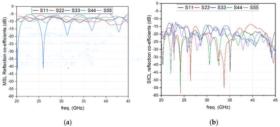 The current distribution diagrams in Figure 6 highlight a smooth distribution of EM energy across the array ports when beam ports 1, 2 and 3 are excited sequentially. As noted earlier in a single SICL line, the SICL-based RL demonstrates a very low radiation loss along the feed line side walls due to its inherent structure sandwiching the design in two substrate layers. The reflection coefficient of both designs is shown in Figure 7a,b. It can be seen that more reflections up to 5 dB are recorded using MSL technology. Mutual couplings between the input beam ports of the SICL design, as shown in Figure 7c, are less than 20 dB which ensures minimum EM loss between the input ports.