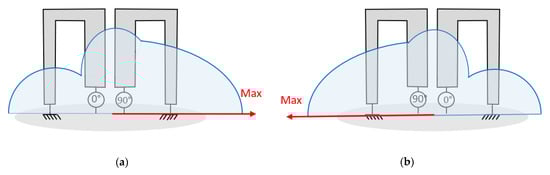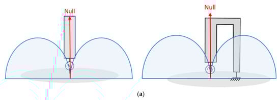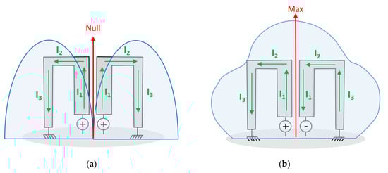 Consequently, when both arms of the antenna are excited with an asymmetrical wave (unbalanced wave), no radiation is observed along the axis of symmetry of the dipole (Figure 3a). We retrieve the typical dipole pattern. However, to obtain a directive behavior, a 180° phase shift is applied to the two arms. As a result, a maximum radiation is now observed along the axis of symmetry in the same frequency range fr < f < 5 fr. By analyzing the electrical currents, we observe that in the case of an asymmetrical feeding, the currents I2 on the two arms of the antenna are opposite. This causes a null of radiation in the axis of the antenna (Figure 3a). However, with a symmetrical feeding (Figure 3b), these two currents add up, which explains the maximum of energy in the axis of the dipole. This maximum is located in the vertical axis because the value of the phase shift is 180°. It is possible that other values such as 90° (or −90°) could redirect this maximum on the right horizontal axis (or left horizontal axis). In other words, using a 90°/−90° coupling circuit, diodes circuits, or even a switch, this antenna design can be seen as a reconfigurable antenna and can still have a directive radiation pattern as mentioned in Figure 4a and b. Otherwise, this behavior is only valid on a narrow band which depends mainly on the antenna height.