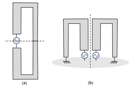 The classic toroidal radiation pattern of the monopole and dipole can be restored throughout the frequency range fr < f < 5 fr by making the structure symmetrical. The conventional folded dipole is designed along a horizontal plane of symmetry, as shown in Figure 2a, but in this paper, we propose to implement this symmetry along a vertical axis and keep the horizontal ground plane (Figure 2b).