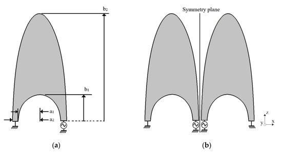 Earlier in the text, we discussed monopoles and dipoles in three dimensions (thick monopoles and dipoles). However, in this paper, we focus only on optimizing planar structures due to their simplified production process and their satisfying performance in terms of matching and radiation. The shape of a semi-elliptical folded monopole antenna that conforms to the principles outlined in the preceding paragraphs, matched to 150 Ω, is shown in Figure 5a. This bending is made of one semi-ellipse and a semi-ellipse hollow. These shapes were chosen because they are known to offer wide bandwidths. The ellipse that defines the outer line has a 0.6 elliptical ratio. The planar structure stands over a ground plane and ends in a short circuit. Various elliptical curves and thicknesses of the monopole were investigated, and the optimal values are outlined in Table 1. The height b2 and the width of the outer ellipse are the dimensions that will mainly define the low frequency of the impedance bandwidth. The inner elliptical trough (hollow), defined by the dimensions a1 and b1, stabilizes the low frequency behavior by changing the current distribution. The currents located on the right edge of the design (Figure 5a) increase with the size of the hollow. To form a dipole, we simply add the symmetrical shape about a vertical plane, as illustrated in Figure 5b. Two of the four ports are grounded, while the two others are connected to the feeding circuit. The gap (g) between the two strands is optimized and produces a 50 Ω matched access. The type of feeding, whether asymmetrical or symmetrical, determines whether it is a null or maximum radiation.