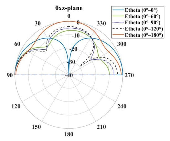 In other words, as explained in Section 2, the phase shift means that the antenna’s maximum radiation is off-point. The radiation of several simulated configurations is shown in Figure 6 in the Oxz plane. The case of an in-phase feeding on both wires (0–0°), implies radiation identical to that of a dipole. This behavior is broadband. If we choose a phase shift between 0° and 180°, then we obtain beam steering. In the presented results, at the lowest frequency where the antenna is well matched (1.6 GHz), the steering is around 90°. As the phase shift increases, radiation at 0° appears until it is in the majority when the feed is symmetrical (0–180°). As mentioned earlier, only the directional behavior of the model fed by a 0–180° (or 0–0°) wave is valid over a wide band.