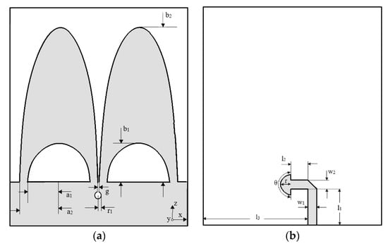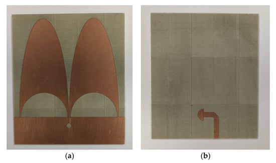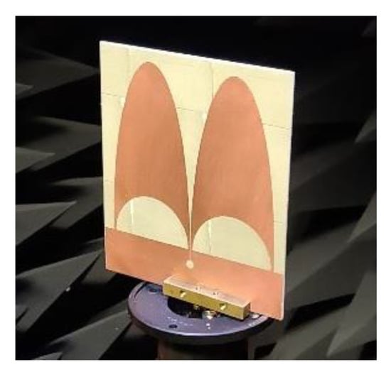 Following the Federal Communications Commission’s (FCC) allocation of the frequency band 3.1 GHz to 10.6 GHz for commercial communication applications in 2002 [], ultra-wideband (UWB) systems have emerged as a significant area of interest in the electronics industry. There are plenty of applications in diverse domains, such as telecommunications, medical, space and military fields [,]. Various types of antennas, such as horns, log-periodic antennas, conical antennas, planar monopoles and dipoles, have been extensively studied to achieve wide bandwidths [,,,,]. These antennas offer optimized transitions from feeding to free space.