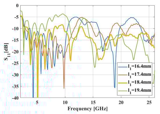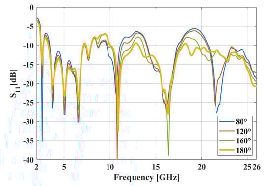 A parametric study on various design parameters of the transition is performed to maximize the frequency range of the antenna. In Figure 8, different l1 lengths are under study. This length impacts the stub position on the slot which changes the impedance matching. Several options are available, depending on the frequency range required. Figure 9 shows the reflection coefficient of a few stub angles (θ). The wider the angle is, the more the S11 is improved, except for the 8–10 GHz frequency range. By combining those results with other minor parametric simulations, we determine the optimized parameters. For example, in this semi-elliptical folded dipole, the combination l1 = 18.4 mm and θ = 180° gave us the best results so far on the whole 2.3–26 GHz frequency range. A1 and b1 are the dimensions (height and width) of the inner semi-ellipse when a2 and b2 are the ones of the outer semi-ellipse.