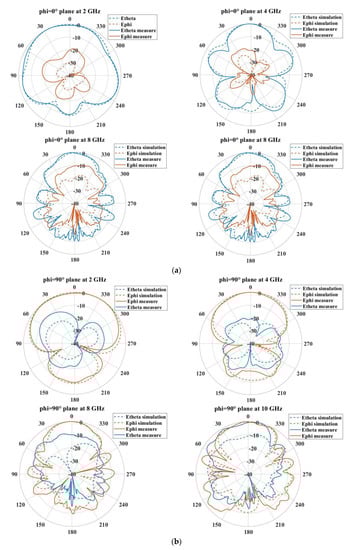 Simulated and measured radiation patterns in (a) phi = 0° plane and (b) phi = 90° plane.
