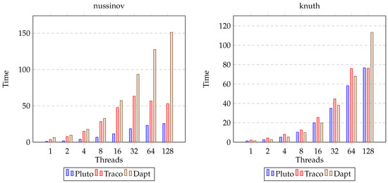 We analyzed the AMD EPYC 7H12 scalability due to the number of threads for the four chosen benchmarks (depicted in Figure 3). The DAPT codes are scalable; however, for the sw kernel, better results are achieved with the Traco compiler. A growing number of threads does not reduce the time for the TRACO codes of the Nussinov and Zuker benchmarks. This is caused by the irregular shapes of tiles. The times for the Pluto code executions are inferior to the rest of the results, particularly for 2d-tiled nussinov [41].