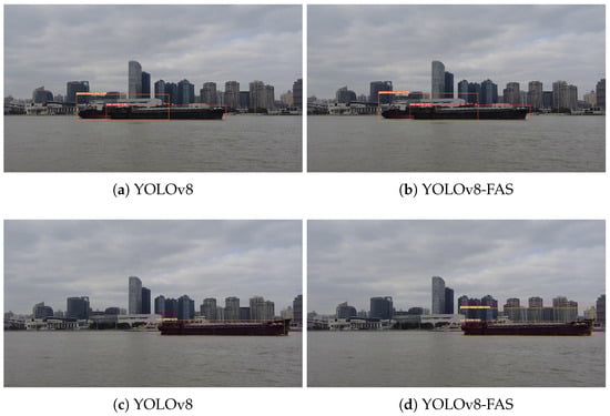 At the same time, the YOLOv8-FAS model further reduces the amount of calculation and number of parameters of the lightweight YOLOv8n model. Compared with the original model, the FLOPs of YOLOv8-FAS are reduced by and the number of parameters by 20%. The light weight of the model is notable, as YOLOv8-FAS enhances the accuracy of ship detection and meets the requirements for a lightweight design, making it hardware-friendly and facilitating subsequent application of the detection results.