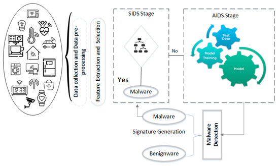 Hybrid IDS was proposed to overcome the limitations of SIDS and AIDS by combining them to detect both known and unknown attacks. Innovative methods were utilized to merge the results of SIDS and AIDS. In our methodology, AIDS was used to identify zero-day attacks, while SIDS was used to detect known attacks. The boosting method was employed to combine the classifiers and reduce the combined model’s bias. The Hybrid IDS comprises two stages: the SIDS stage and the AIDS stage, as shown in Figure 2. The objective of AIDS is to create profiles of normal node activity and raise an alarm if the difference between regular requests exceeds a predefined threshold for a particular observation. The profiles of nodes were generated by utilizing benign action records. The system then observes the traffic’s behavior and compares the new records with the built profiles to identify any anomalies. When a malicious request is detected, the system stores it in the signature database to protect against similar attacks in future malicious activities. In other words, SIDS will have a suitable history of previously known attacks.