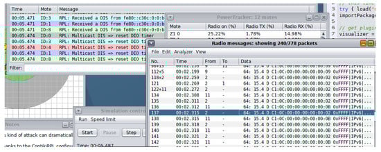 Contiki OS was used to create an adaptive intrusion detection system that is distributed. This operating system supports the IP for sensor networks and was initially built on the foundation of IPv4. Later, when the 6LoWPAN specification was established, IPv6 functionality was introduced. The RPL now supports IPv6 implementation, which was previously lacking []. Contiki was chosen because it supports IPv6 and RPL. To test and simulate the system, the Cooja simulator was employed, which is a Java-based simulator that supports Contiki OS on multiple levels. It has different interfaces that are used to collect various types of information. The RPL protocol implementation is available in the Contiki source code, and default parameters have been used, including a wake-up interval of 125 ms. The mote output window in Figure 3 records packet information, such as packet length and type of information being exchanged. Power Tracker, available in Cooja, is used to record power usage in the motes and display radio communications between nodes, including RX and TX signals.