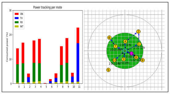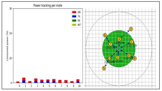 Figure 5 to the right of the screen displays a network that includes the malicious node 11 as well as other nodes. Figure 5 on the right shows the network’s power utilization. On the left side of Figure 5, it can be observed that the network’s power consumption is significantly more than 15%. RX is high for typical sensor nodes. This is because a DIO packet from within the malicious mote is continuously received by the nodes. TX and RX are both high in the malicious mote. This is because they are transmitting and receiving high multicast packets simultaneously.