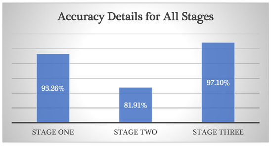 According to Figure 6, the malware detection accuracy with the IoT intrusion dataset was 93.26% in stage one and 81.91% in stage two. However, in stage three, the accuracy improved to 97.1%. Therefore, the proposed framework provides a higher detection accuracy and a lower false alarm rate compared to using only a single stage of detection.