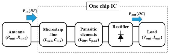 In recent years, microwave wireless power transfer (MWPT) has attracted much attention as a method of powering sensor ICs of IoT devices []. Using 1 trillion sensor ICs per year is predicted in the near future by development of 5G and Artificial Intelligence []. If each of these devices is equipped with batteries, a large number of sensor ICs will need to be maintained for the battery with a significant cost increase. MWPT can reduce this cost, and ultimately, reduce this to zero. In addition, because MWPT uses electromagnetic (EM) waves for the power source, a wireless communication network can be built in the same time to receive and transmit sensed data. A MWPT system mainly consists of a transmitter for radiating EM waves and a receiver with a receiving antenna and a rectifier for capturing the radiated EM waves. This combination of receiving antenna and rectifier is called a rectenna []. Figure 1 shows a block diagram of a rectenna.