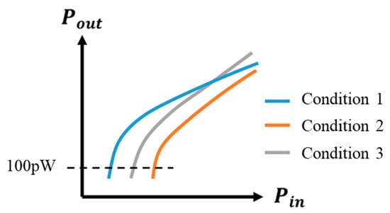 In this section, rectifier design parameters are determined in such a way that the input power required to generate 1 V at the output terminal of the RF–DC CP is minimized with 65 nm CMOS. The sensitivity of the rectifier is defined by the input power to achieve 100 pW at Vout of 1 V and f of 920 MHz in this paper. This results in Pin − Pout curves with different parameter conditions at Vout of 1 V, as shown in Figure 3. In this example, we will call “Condition 1” optimum because its sensitivity is the lowest among the three conditions.