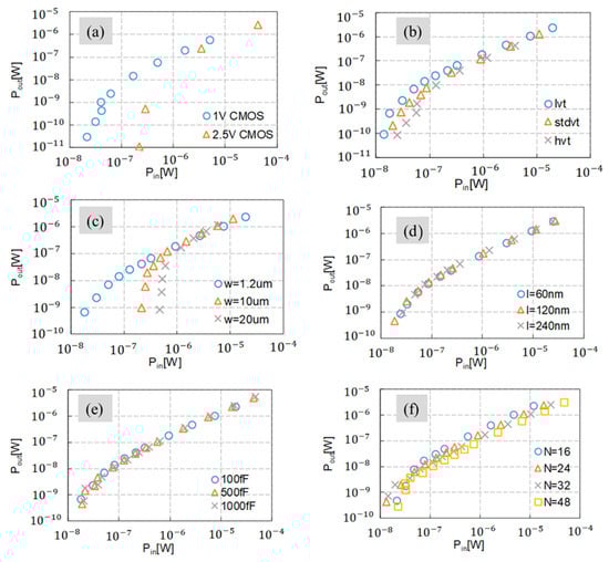 with variations of CMOS (a), VTH (b), total gate width (W × nf) (c), L (d), Cin (e) and N (f).