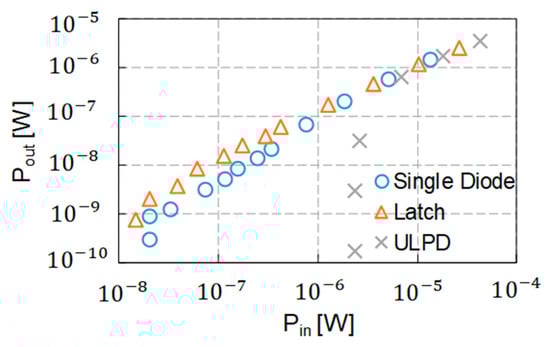 To compare the performance of RF–DC converters with different switching circuits, single diodes and ULPDs are also designed with the same design parameters, as shown in Table 2. SPICE results for Pin − Pout are shown in Figure 6.