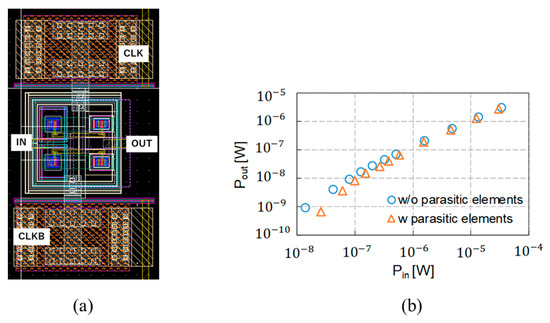 Stage layout of CMOS latch rectifier (a) and Pin − Pout with and without parasitic elements of CLK/CLKB wires (b).