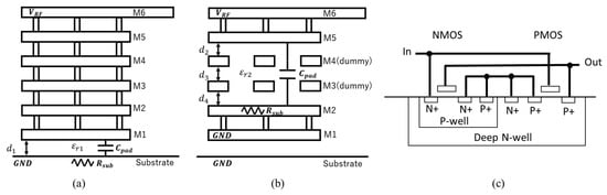 Another focus was a pad structure. With an original design [], as shown in Figure 8a, SPICE simulation for the rectifiers with Cpad − Rsub parasitic elements included showed a significant impact of Rsub of 6Ω on the sensitivity, where Cpad is pad capacitance and Rsub is substrate resistance between the portion under the pad and a ground terminal. In this design, a pad structure, as shown in Figure 8b, was used. To shield the pad with ground, M1 and M2 were assigned to ground lines. To reduce the pad capacitance, M3 and M4 were left floating as dummies. As a result, the sensitivity was improved by approximately 7 dB, as shown in Figure 8b.