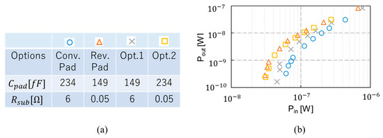 An additional simulation was performed to investigate which parameter of Cpad and Rsub was critical, as shown in Figure 9. Opt. 1 is the case where Cpad is as low as the proposed pad whereas Rsub is as high as the conventional one, and Opt. 2 is the case where Cpad is as high as the revised pad whereas Rsub is as low as the conventional one, as shown in Figure 9a. Because Opt. 2 was well matched with the case with the revised pad, it is concluded that Rsub is more critical than Cpad.