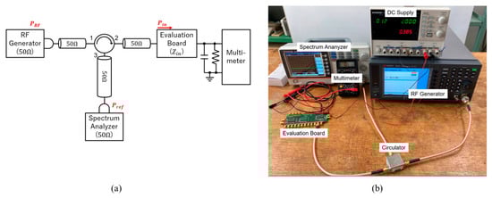 Figure 11a shows a block diagram of the measurement setup. Figure 11b shows its photo. The input power to the rectifier is calculated based on the output power of RF generator (PRF), the reflection power (Pref), and loss of each of the connectors and cables []. Balanced–unbalanced transformation is placed on microstrip-line for rectifiers because the signal from the RF generator is an unbalanced signal.