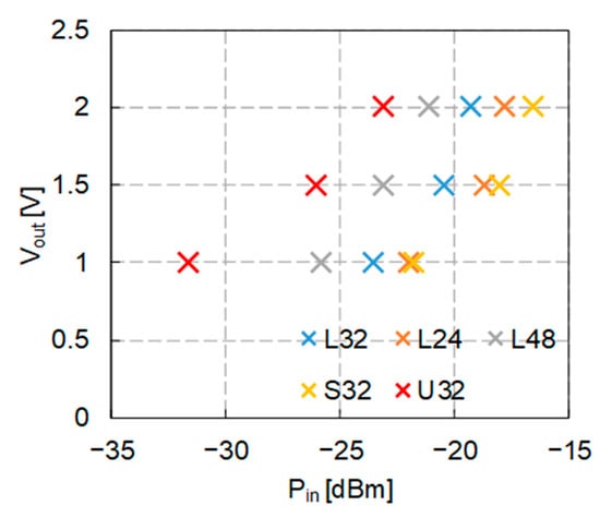 Measured and simulated results are in good agreement for Pin > 100 µW or Pout > 10 µW. On the other hand, the starting points at which Pout − Pin slopes become steeper are different between measured and simulated, especially in latch-type and single-diode rectifiers. We were not able to identify the root cause of the degradation. Its investigation will be needed in the future to reduce the lower bound of the input power. Table 4 summarizes the sensitivity of each rectifier. A sensitivity of −31.7 dBm was achieved with 0.011 mm2 U32.