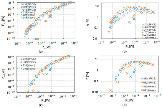and represent the parasitic inductance and parasitic capacitance of microstrip-line, respectively. SPICE simulation was conducted with different values for and depending on the length of microstrip-line because of the length of microstrip-line on evaluation board is varied by rectifier. The parasitic inductance of bonding wire is estimated as 8 nH and the parasitic capacitance of bonding pad is 200 fF. In this SPICE simulation, the effects of wiring parasitic capacitance, parasitic resistance and well parasitic diodes of transistor were considered. Figure 14a–d compare Pout vs. Pin and η vs. Pin is under the condition of output voltage .