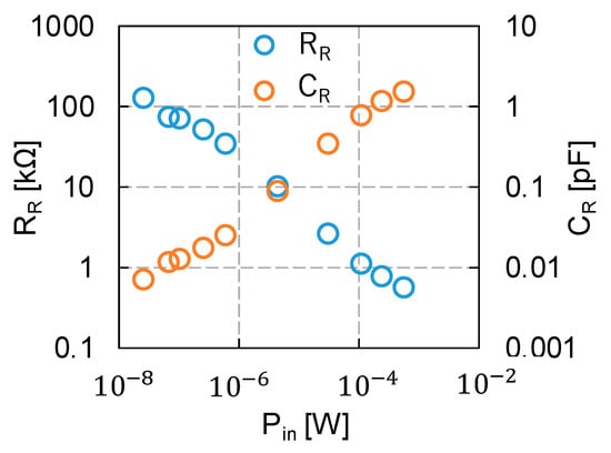 One potential cause on the discrepancy in Pin − Pout curves in the low-power region is as follows. The input impedance of the rectifiers is widely varied over input power, as shown in Figure 15. and are equivalent input resistance and capacitance, respectively, when the input impedance is expressed by a parallel RC circuit. In the high-input-power region, becomes low because becomes large and becomes low. In contrast, in the low-input-power region, becomes high because becomes large and becomes high. Thus, when Pin is swept in a wide power range, the input impedance of the rectifier largely varies. As a result, Pin − Pout curves were measured without any matching circuit rather than replacing the matching circuit by Pin repeatedly.