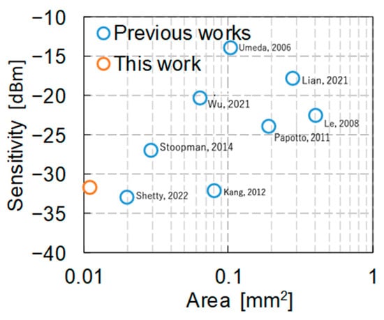 Those values of area and sensitivity are plotted in Figure 17. This work achieved the smallest rectifier area and a sensitivity as close as the best candidates [].