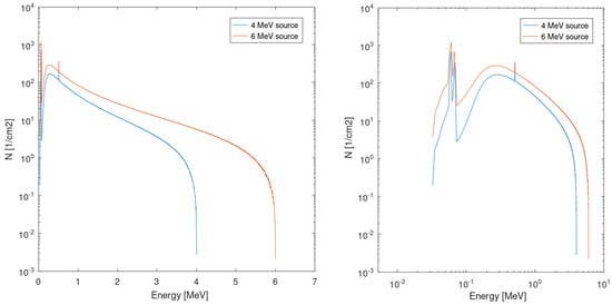 The Monte-Carlo simulated spectrum of photons emitted from the 1 mm thick tungsten plate irradiated by the 4 MeV and 6 MeV electrons. The same data are plotted twice: using a linear–logarithmic scale (left plot) and a logarithmic–logarithmic scale (right plot).