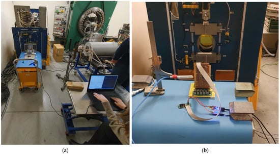 Test setup during irradiations and functional/electrical tests of the OBC: (a) depicts a segment of the test facility, featuring the accelerator situated on the left, with the OBC positioned on a nearby table. An operator seated at another table conducts functional tests after irradiation step. (b) illustrates the OBC placed in proximity to the accelerator window and the ionization chamber utilized for dosimetry. Communication cables are connected to the OBC for conducting functional tests.