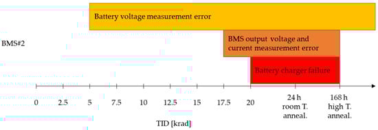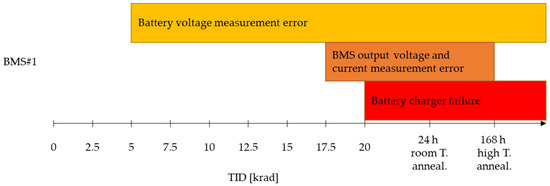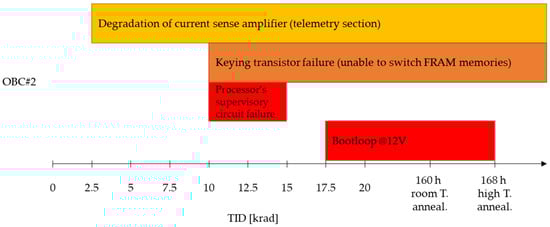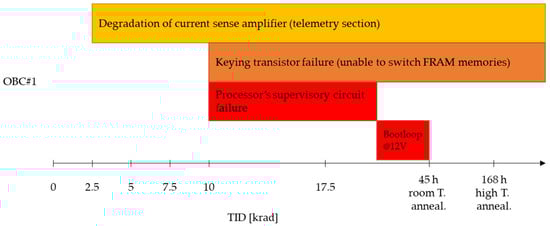 Most of the OBC functions that could be verified during irradiation were operating correctly. However, four errors were observed across different components or sections of the OBC. Three errors—degradation of the current sense amplifier, keying transistor failure, and failure of the processor’s supervisory circuit—resulted from single component failures. These components were subsequently replaced with more radiation-tolerant alternatives in the final design. The origin of the fourth error, a boot loop in the 12 V bank, could not be precisely determined. In both OBCs, it started after the 17.5 krad step, but in OBC#1, the error was observed when the device was already transported from the irradiation facility to Creotech Instruments premises for annealing. The error disappeared in OBC#1 after room-temperature annealing, whereas in OBC#2, it disappeared after 1 h of the high-temperature annealing.