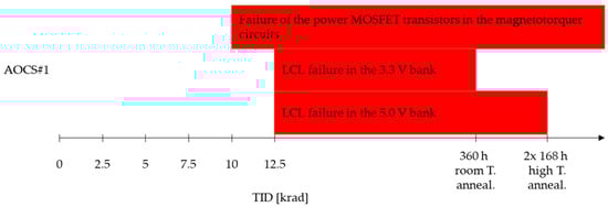 AOCS#1 underwent irradiation up to 12.5 krad, where critical errors in the LCL (latch-up current limiters) resulted in the failure to power two banks—3.3 V and 5 V. One of the LCL chips recovered after room-temperature annealing and another after high-temperature annealing. In the case of AOCS#2 testing, a different lot’s LCL was employed; yet, it also failed just before reaching 12.5 krad. Consequently, the LCL on the AOCS#2 board was bypassed to continue testing of the subsystem.