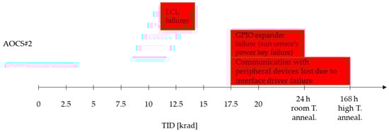 Finally, the orange color represents the results for LCLs in both AOCS boards. The same type of LCL (same manufacturer and reference number) functioned correctly up to 20 krad in the OBCs. For the AOCS design, a new lot was chosen, which has shown better electrical performance—but it failed at 12.5 krad in AOCS#1. Subsequently, a third lot also failed at 12.5 krad during the AOCS#2 test campaign. This TID level of failures gives too little margin for the target mission, and a replacement for the component was searched for. The procurement of LCL components occurred during a global shortage of electronic components due to the pandemic, potentially contributing to significant variations between different lots. These variations might indicate variations in the manufacturing process, semiconductor fabrication plant, or even semiconductor layout, impacting the parameters of the new lots. This situation underscores the importance of testing the exact component lot planned for use in the flight model of the system. The change in electrical performance of the new lot might serve as an indicator that different radiation performance could be expected. However, no change in electrical performance does not mean that no change in the radiation response of the new lot is guaranteed [].
