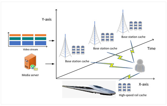 Cache placement can reduce video transmission delay and the negative impact of network bandwidth jitter. Cache technology is also one of the techniques commonly used by scholars to reduce video transmission delay. Xu et al. [] proposed a user-assisted base station (BS) storage and cooperative prefetching scheme for high-speed railway (HSR) communication, which improves the system throughput. However, it does not consider the environmental factors of users watching videos. A mobile edge network streaming media optimization framework based on privacy-preserving learning was proposed in [], which included a user data privacy scheme and dynamic video cache algorithm. However, the strategy proposed by the literature is in the scenario of low mobility speed, and does not consider some characteristics of the high-speed railway mobile scenario. In high-speed networks, users move very fast, so the calculation of cache placement location and time is also a very critical challenge.