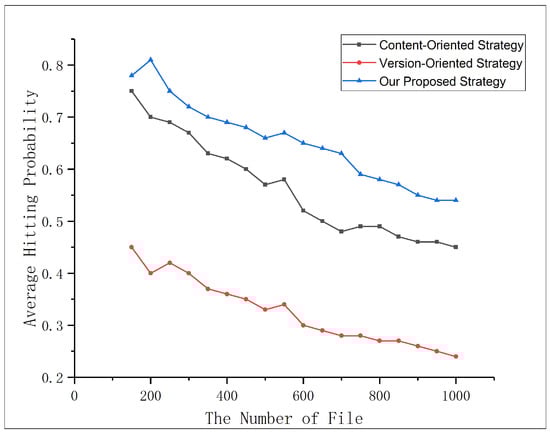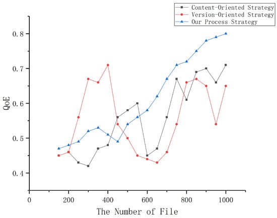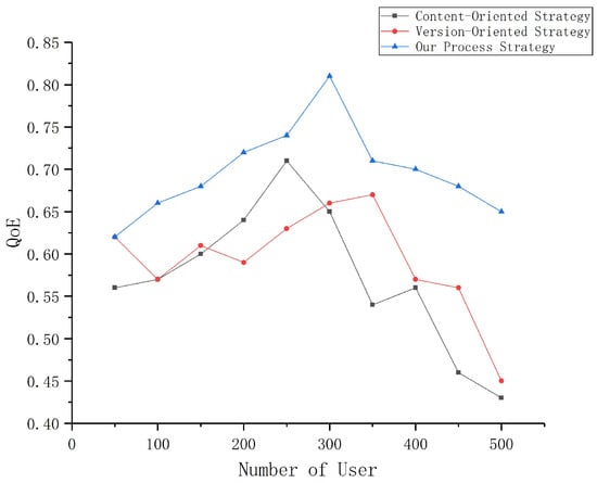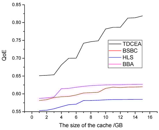 As shown in Figure 6, as the number of users increases, the user’s QoE decreases because the cache space occupied by each user decreases. At this time, when the user requests a file, the probability of finding the requested file in the sever decreases, so the QoE decreases. However, the performance of the strategy proposed in this paper is still better than those of the above two strategies. The strategy proposed in this paper is more suitable for video transmission in high-speed mobile networks.