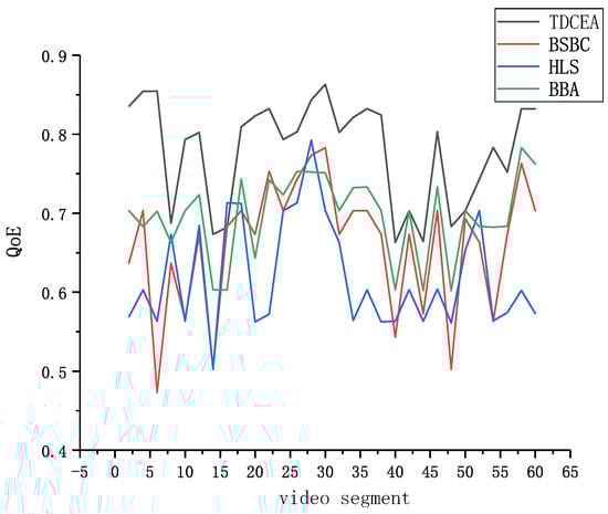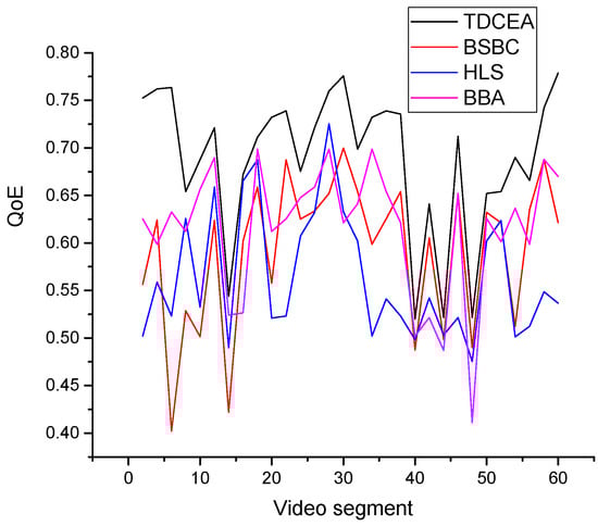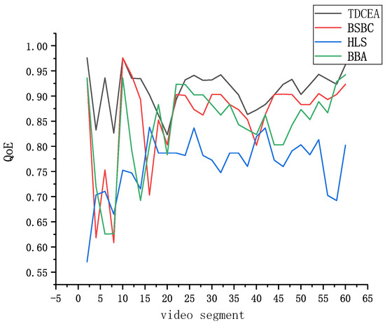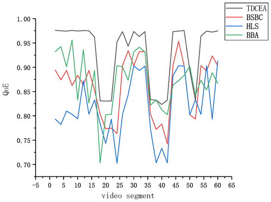 In Figure 7, the content movement of the video Boat is slow, so the encoded data are small, and the required bandwidth is small, resulting in the highest bitrate video playing smoothly for the user. The algorithm proposed in this paper can quickly find the local optimal solution, thus obtaining high QoE performance. In addition, in Figure 8, the QoE of the HLS algorithm is lower than that of other algorithms, especially at the beginning of the transmission, because the algorithm randomly selects the video bitrate at the beginning, making it more unstable. However, the algorithm proposed in this paper performs well in the initial bitrate selection. In Figure 9, watching the video RitualDance, because there are many elements in the video and the scene changes faster, the encoded data are larger, and thus users cannot watch the high bitrate video smoothly, resulting in lower QoE. However, the algorithm we proposed still maintains good performance, indicating that it can still perform well under high load. In general, the algorithm we proposed is relatively superior in high-speed environments.