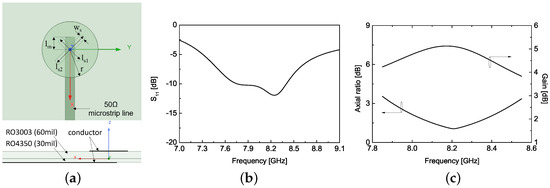 In this subsection, a detailed design process of the unit radiating element is described. The conventional method to achieve circular polarization characteristics has been applied to the radiating element design []. The proposed antenna comprises two different substrates: one for the feed network and another for the radiating elements. These substrates are coupled by cross-shaped coupling slots placed between them. As shown in Figure 1a, a 50 feed line is positioned on the bottom of the 30 mil thick RO4350 substrate, and a circular shaped patch designed to radiate at the operating frequency of 8.2 GHz is etched on the top of the 60 mil thick RO3003 substrate.