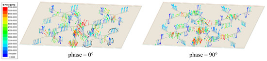 To properly feed the 16 radiating elements that form a 4 × 4 array, the power divider shown in Figure 3a is extended to have 16 output ports. This could be accomplished with ease by connecting four identical dividers to the output port of a 1:4 power divider, taking into account the electrical length of the additional 50 lines between the dividers, since the feed network was designed for a 2 × 2 subarray. For further clarification, the electric field distributions at the center frequency for the different input signal phases at port 1 are shown in Figure 4. The electric field distribution at the end of a subarray can be simply represented by the black dotted lines. When the input phase changes to , the electric field distribution at the end of the subarray can be seen rotating in a counterclockwise direction, and the same distribution is observed in the neighboring subarray, which is sequentially rotated by = . As a result, the proposed CP antenna is designed with four 2 × 2 subarrays, each having the same polarization characteristic, to achieve right-handed CP, and the sequentially rotated serial feed network is employed to construct the proposed array antenna.