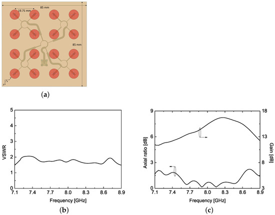(a) Proposed circularly polarization 4 × 4 array antenna, (b) simulated VSWR, and (c) simulated AR and gain.
