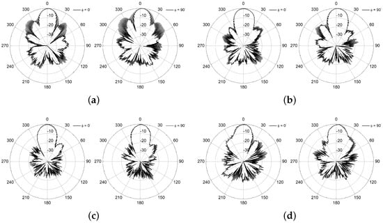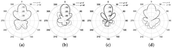 Measured radiation patterns of the proposed antenna at different frequencies: (a) 7.8 GHz, (b) 8.2 GHz, (c) 8.6 GHz, and (d) 9.0 GHz.