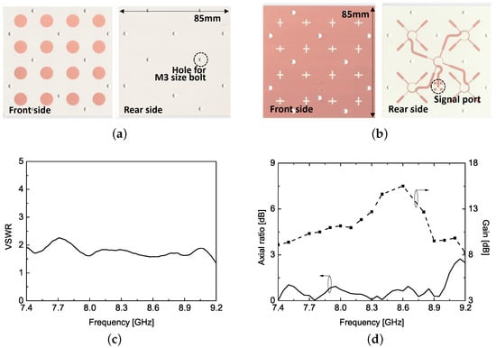 Photograph of the fabricated antenna and its measured results: (a) front and rear sides of RO3003, (b) front and rear sides of RO4350, (c) measured VSWR, and (d) measured AR (solid line) and gain (dashed line).