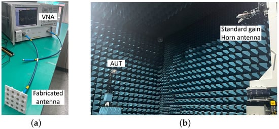 The proposed CP antenna is fabricated and measured to verify the design theory. As mentioned in the unit radiating element design, the 60 mil and 30 mil thick substrates are used for the 4 × 4 radiating elements and feed network, respectively. Photographs of the fabricated circuits are shown in Figure 7a,b. The rear side of RO3003 is completely etched out because the front side of RO4350, which contains the coupling slots between the radiating elements and the feed network, can provide the electrical ground. Two substrates are mechanically laminated and aligned together using M3-sized plastic bolts and nuts through holes in both substrates. A surface-mounted device (SMD) type SMA connector from Molex (Lisle, IL, USA), which can be used up to 18 GHz, is soldered and used for measuring. The signal port is also grounded through via holes.