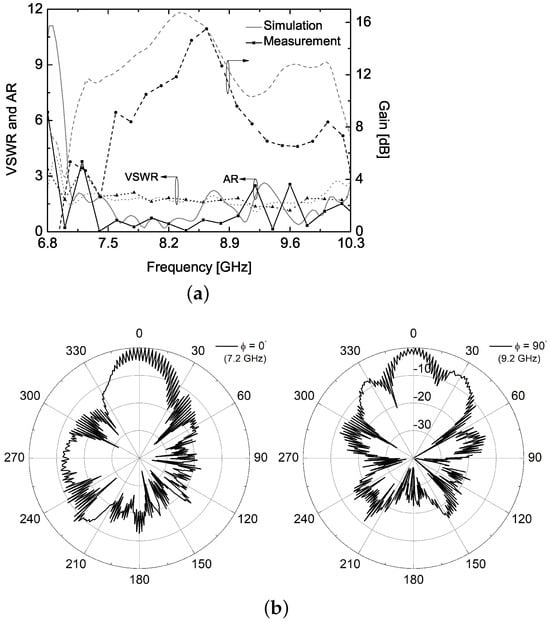 Experimental results of the proposed CP antenna with a wide frequency span: (a) VSWR, AR, and gain characteristic and (b) radiation patterns at 7.2 GHz and 9.2 GHz.