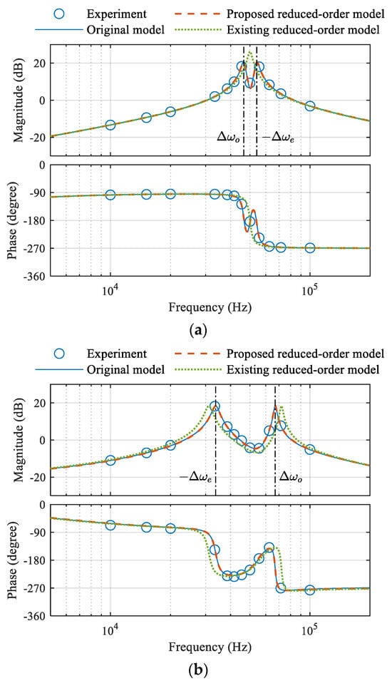 In the experiment, to obtain the small-signal bode diagram of the transfer function , a low-frequency (10~100 kHz) phase perturbation signal of 7.2° magnitude (corresponding to 20 ns) was injected into the steady-state  using a variable time-delay unit, and the responded  was measured by a high-bandwidth current transformer (CST4835), a zero-crossing detector (LMH7220), and a digital phase detector on the Zynq board. Then, the measured time-domain data of  and  were processed with discrete Fourier transform to obtain  at a particular perturbation frequency. Figure 12 shows the small-signal bode diagrams at the steady states of different operating conditions. When the coupling was strong, the gain curve had two peaks that corresponded to the split beat frequencies Δωo and −Δωe, as shown in Figure 12a,b. When the coupling was weak, the two gain peaks merged into one, as shown in Figure 12c. Under all tested operation conditions, both the proposed reduced-order model and the original dynamic phasor model accurately predicted the small-signal characteristics. However, the existing reduced-order model failed to predict the two gain peaks under the tuned and strong coupling condition, and had a bit peak frequency error under the detuned condition.