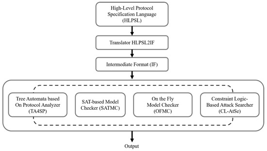 The security of the proposed cryptographic protocol is formally validated using AVISPA, a widely accepted tool for analyzing security protocols [,]. AVISPA specifically verifies protocols against replay and man-in-the-middle attacks. The tool utilizes the High-Level Protocol Specification Language (HLPSL) [] to define the security features of protocols. The AVISPA employs four back-end models []: “constraint logic-based attack searcher (CL-AtSE)”, “on the fly model checker (OFMC)”, “SAT-based model checker (SATMC)”, and “tree automata based on protocol analyzer (TA4SP)”. The process involves translating the HLPSL code into an Intermediate Format (IF) using the “HLPSL2IF” translator, and then it is analyzed by the four back-ends to assess security properties. Figure 3 illustrates this process, and a detailed description of HLPSL can be found in [,].