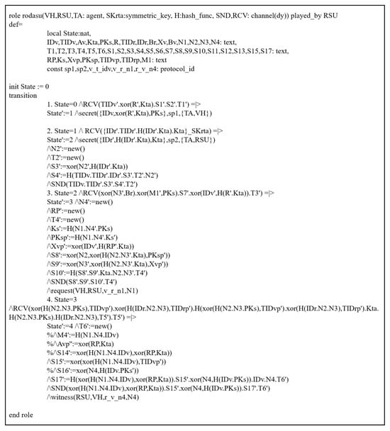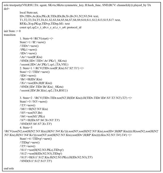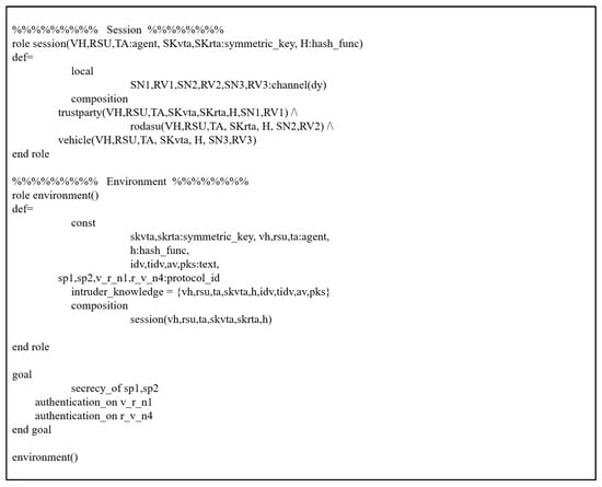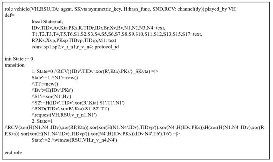 To evaluate the security of protocols through this simulation, all phases of Xu et al.’s scheme are presented using HLPLS code. We have tested it by considering the authentication phases among entities. In Xu et al.’s scheme, there are three basic roles (TA, VH, RSU), and their descriptions are illustrated in Figure 4, Figure 5 and Figure 6. The environment and session are shown in Figure 7.