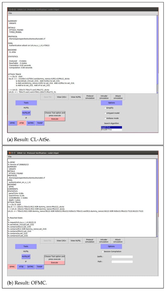 Figure 8 displays the results from the OFMC and CL-AtSe, indicating “UNSAFE”. Consequently, Xu et al.’s scheme cannot prevent replay and man-in-the-middle attacks.