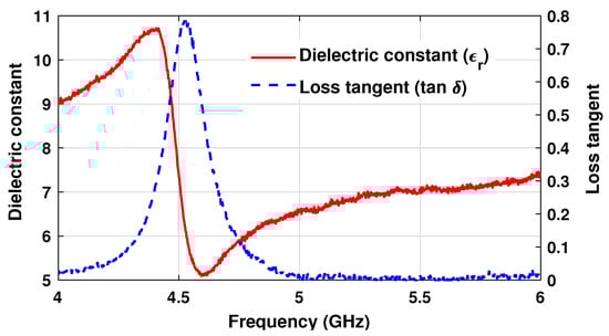 The main characteristics of interest are optical transparency (Tsub), dielectric permittivity (), and the tangent of the loss angle (). The dielectric parameters were measured using the Vector Network Analyzer combined with the 85,070 B dielectric probe kit with a tolerance of and on the dielectric permittivity and dielectric losses, respectively. The measurement results of and are shown in Figure 1. According to this figure, the measured values at a frequency of are and .