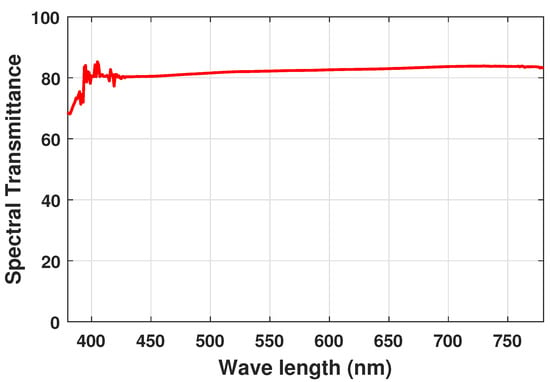 The other parameter studied is optical transparency in the visible spectrum. This parameter was measured using an optical bench at room temperature and a MINOLTA-CS-1000 spectroradiometer. First, the luminance of the OLED was measured. Secondly, the glass substrate was inserted through a lens holder in front of the objective, in order to intercept the entire luminance. Transparency is the ratio of the latter luminance to the first result at the corresponding wavelength. Figure 2 illustrates this optical transparency; the median value is around 82.5%. Noise below 480 results from low emission in this band, leading to an increased noise level.
