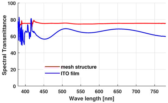 Optical transparency is another parameter that has been studied. Figure 4 illustrates a comparison between the optical transparency of the ITO film and the honeycomb structure from 380 to . Although large mesh dimensions are needed to obtain high optical transparency, this also increases sheet resistance. From this figure, the mesh structure has excellent transparency compared to the ITO throughout the entire visible spectrum. The measured transparencies remain constant. The median transparency value of the network structure is around 75.4%, while that of the ITO film is 65.1%. Note that the measured transparencies are the sum of the transparencies of two layers of the ITO and meshed structure deposited on the glass substrate.