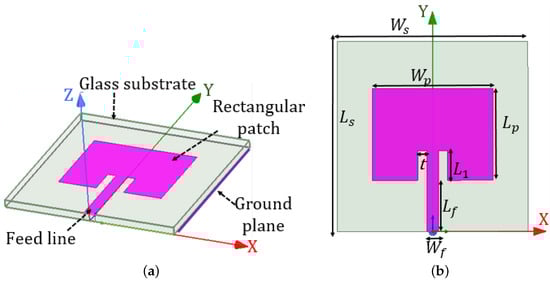 A reference non-transparent patch antenna was first designed using an entirely copper film. The geometry of the non-transparent antenna is shown in Figure 6. This antenna consists of a radiating element on one side of the glass substrate (thickness of ) and a ground plane on the other side.