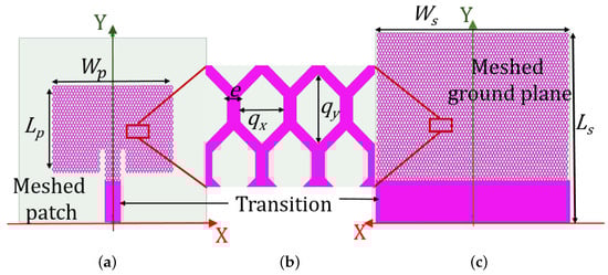 Transparent antenna geometry: (a) meshed radiating patch, (b) mesh cells, and (c) meshed ground plane. and .